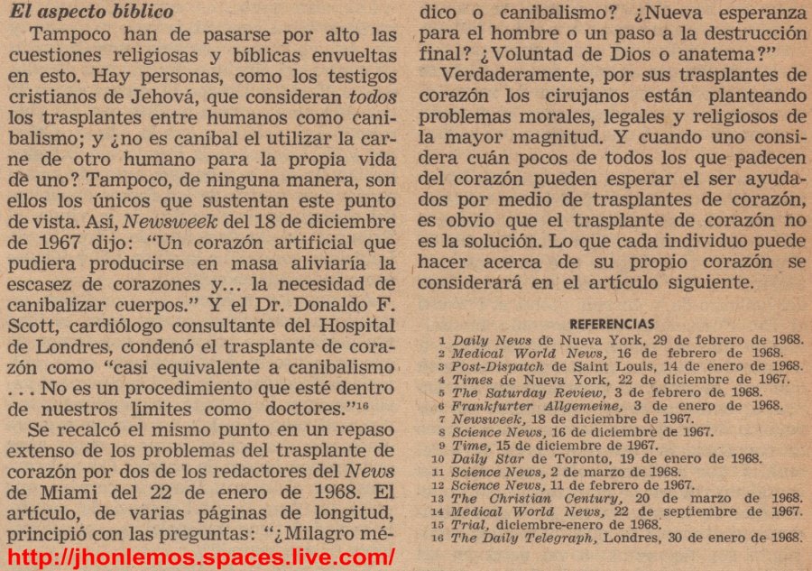 “Los Testigos Cristianos de Jehová, que consideran todos los transplantes entre humanos como canibalismo…”.