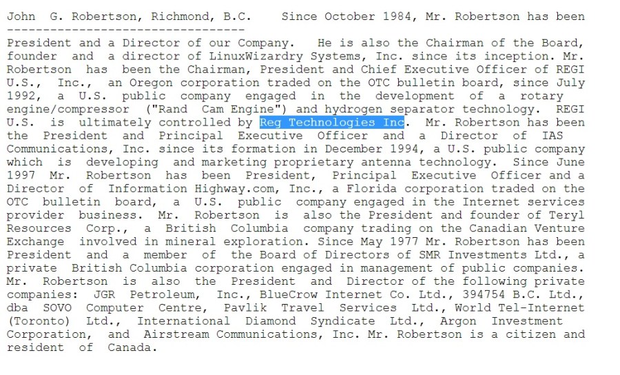 El señor John G. Robertson ha sido Presidente y miembro del Consejo de Administración de SMR Investments Ltd., también es el Presidente y Director de JGR Petroleum, Inc., BlueCrow Internet Co. Ltd., Pavlik Travel Services Ltd., World Tel-Internet (Toronto) Ltd., Argon Investment Corporation y Airstream Communications, Inc. Véase http://www.sec.gov/Archives/edgar/data/925541/000101540201503560/doc1.txt