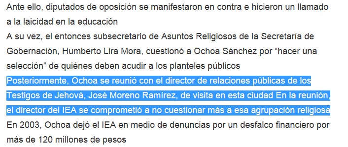 “… el entonces subsecretario de Asuntos Religiosos de la Secretaría de Gobernación, Humberto Lira Mora, cuestionó a [Miguel Ángel] Ochoa Sánchez por “hacer una selección” de quiénes deben acudir a los planteles públicos posteriormente, Ochoa se REUNIÓ con el DIRECTOR DE RELACIONES PÚBLICAS DE LOS TESTIGOS DE JEHOVÁ, José Moreno Ramírez…”.