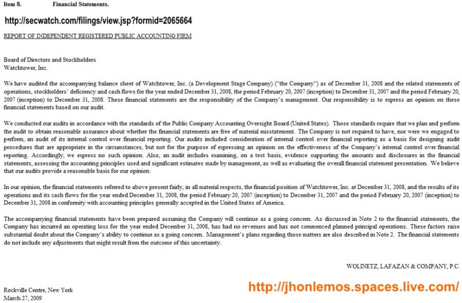 Form 10 K Annual Report Pursuant to Section 13 or 15d of the Securities Exchange Act of 1934 Watchtower, Inc. – Información obtenida de http://secwatch.com/filings/view.jsp?formid=2065664