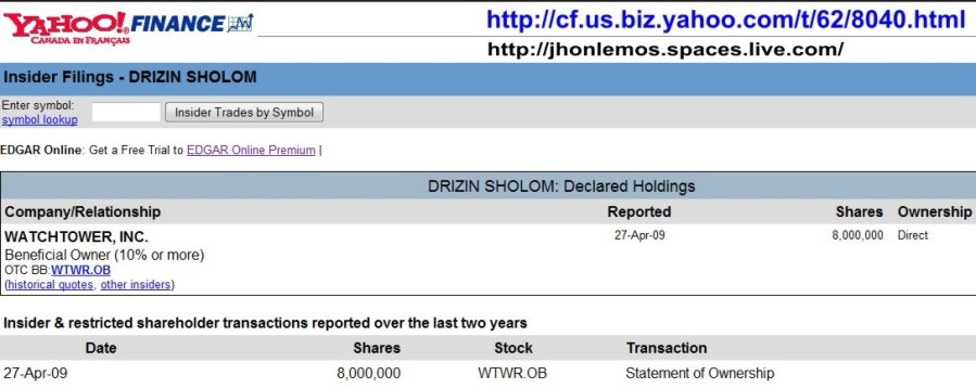 Drizin Sholom – Insider Filings Watchtower, Inc. – Información obtenida del sitio web: http://cf.us.biz.yahoo.com/t/62/8040.html