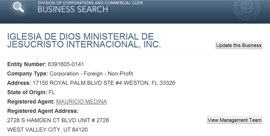 El sitio web https://secure.utah.gov/bes/action/details?entity=6391605-0141 también menciona la dirección: 17150 Royal Palm Blvd #4 Weston, FL 33326 United States como un domicilio de la secta: “Iglesia de Dios Ministerial de Jesucristo Internacional” (Church of God Ministry of Jesus Christ International).