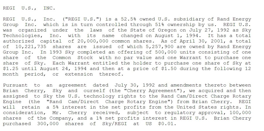 “REGI U.S., Inc. (“REGI U.S.”) is a 52.5% owned U.S. subsidiary of Rand Energy Group Inc. which is in turn controlled through 51% ownership by us. REGI U.S. was organized under the laws of the State of Oregon on July 27, 1992 as Sky Technologies, Inc. with its name changed on August 1, 1994.”