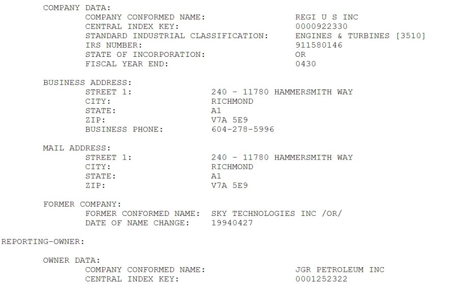 Sky Technologies, Inc., se crea bajo las leyes del Estado de Oregon en julio 27 de 1992. Pero a partir del 1 de agosto de 1994, cambia oficialmente el nombre por “REGI” U.S., In., Ahora bien, ellos son controlados por: Rand Energy Group Inc., (“RAND”) que, a su vez, está controlada por el 51% por Reg Technologies Inc., véase http://www.sec.gov/Archives/edgar/data/922330/000106299302000371/form10k.txt