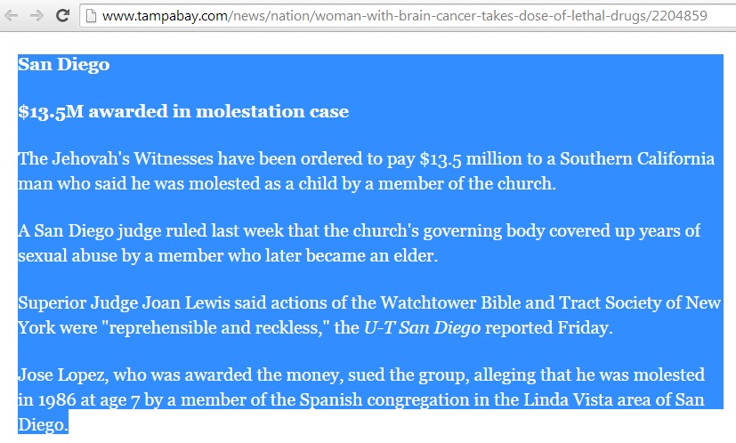 Jose Lopez, who was awarded the money, sued the group, alleging that he was molested in 1986 at age 7 by a member of the Spanish congregation in the Linda Vista area of San Diego.” (http://www.tampabay.com/news/nation/woman-with-brain-cancer-takes-dose-of-lethal-drugs/2204859)