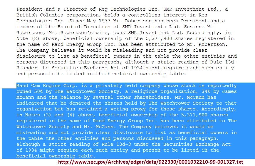 Este documento demuestra que la Sociedad Watchtower es dueña del 50% de las acciones de Rand Cam Engine Corp. Hay un 34% que es del señor James McCann y el resto por otros accionistas. Es muy importante precisar que el señor James McCann donó las acciones propiedad de la Sociedad Watchtower, pero ha mantenido un poder de voto para dichas acciones. En consecuencia, en las Notas (3) y (4) anterior, los beneficiarios finales de las 5.073.200 acciones registradas a nombre de Rand Energy Group Inc. se ha atribuido a la Sociedad Watchtower y al señor James McCann. Véase http://www.sec.gov/Archives/edgar/data/922330/000106299302000371/form10k.txt