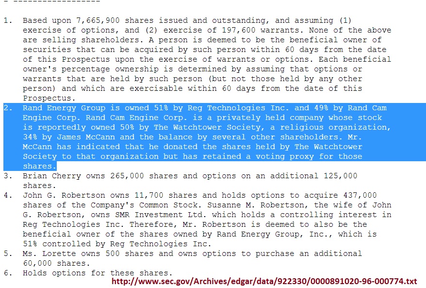 La Sociedad Watchtower es dueña del 50% de las acciones de Rand Cam Engine Corp. Hay un 34% que es del señor James McCann y el resto por otros accionistas. Es muy importante precisar que el señor James McCann donó las acciones propiedad de la Sociedad Watchtower, pero ha mantenido un poder de voto para dichas acciones. En consecuencia , en las Notas (3) y (4) anterior, los beneficiarios finales de las 5.073.200 acciones registradas a nombre de Rand Energy Group Inc. se ha atribuido a la Sociedad Watchtower y al señor James McCann.